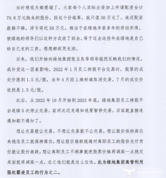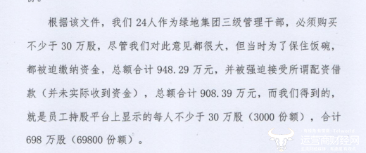 信中称,2019年7月,绿地集团下发《关于实施<绿地集团干部员工“富有计划”>的通知》,以红头文件强制要求所有管理干部必须购买公司员工持股平台的股份。