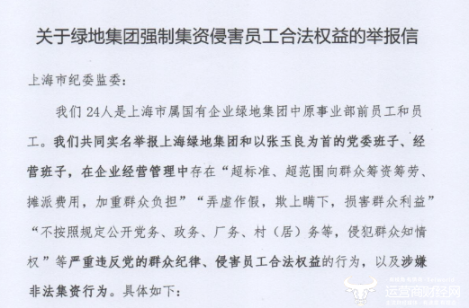 1月25日下午,一封《关于绿地集团强制集资侵害员工合法权益的举报信》在网络平台迅速流传,举报人自称是24名绿地集团中原事业部的前员工和现员工,共同举报上海绿地集团以及集团董事长张玉良为首的党委班子、经营班子。绿地集团到底做了什么事,竟让24人实名、甚至摁下红手印举报呢?