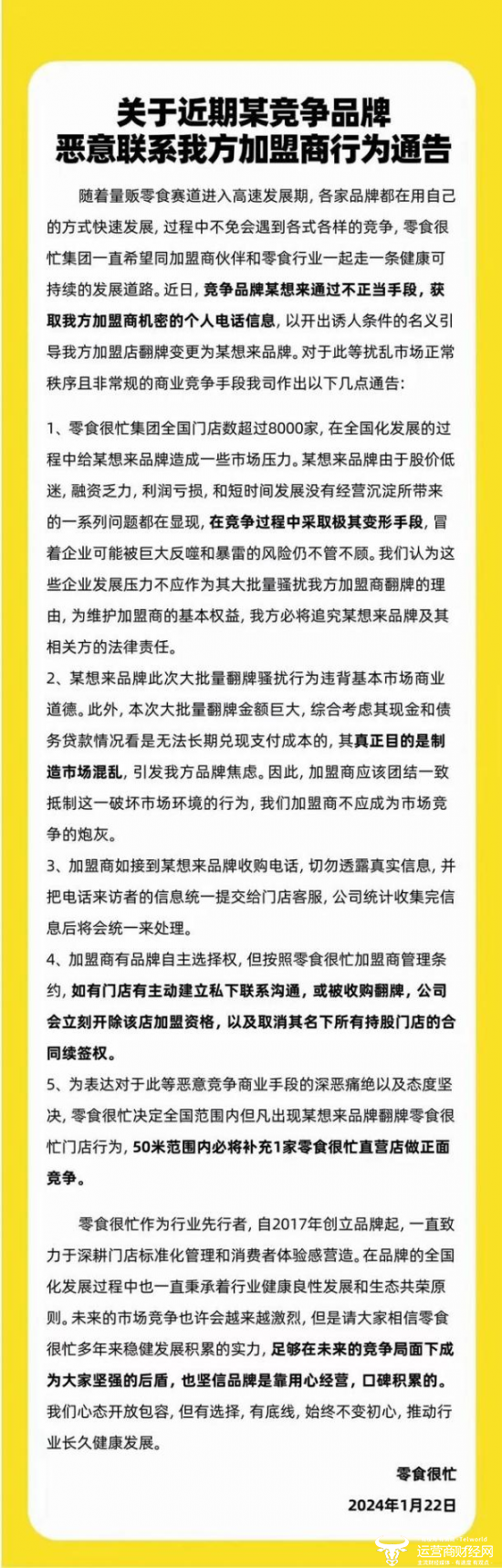 近日,零食很忙在内部发布了《关于近期某竞争品牌恶意联系我方加盟商行为通告》,上面显示,近日有竞争品牌通过不正当手段,获取其加盟商机密的个人电话信息,以开出诱人条件的名义引导其加盟店变更为某想来品牌。为维护加盟商的基本权益,我方必将追究某想来品牌及其相关方的法律责任。除此之外,通告中也表明了一些反击的行为。