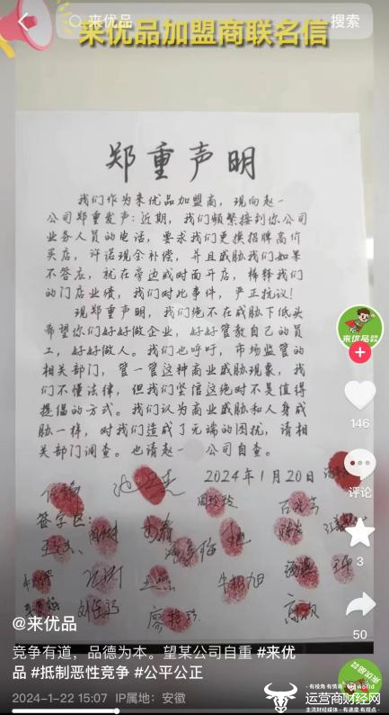 在1月22日,万辰集团旗下来优品品牌的加盟商在其官方抖音账号上发布了加盟商联名信,称“我们作为来优品加盟商,现向赵一*公司郑重发声:近期,我们频繁接到你公司业务人员的电话,要求我们更换招牌高价买店,许诺现金补偿……”联名信上有签字及手印。