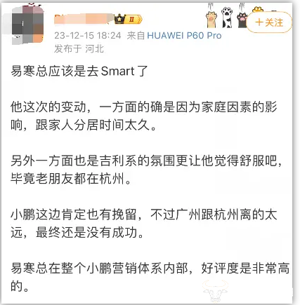 不过网上也有网友发言称:易寒总在整个小鹏营销体系内部好评度是非常高的。