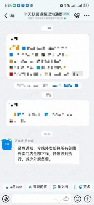 同时,网传的一份聊天截图显示,在一个名为“半天妖运营经理沟通群”中,一位名为“万光涛”的发布了相关通知。天眼查显示,万光涛是半天妖总经理,负责营运端业务,不仅如此,他也是半天妖(上海)实业有限公司、上海半天妖餐饮管理有限公司等多家企业的法定代表人。