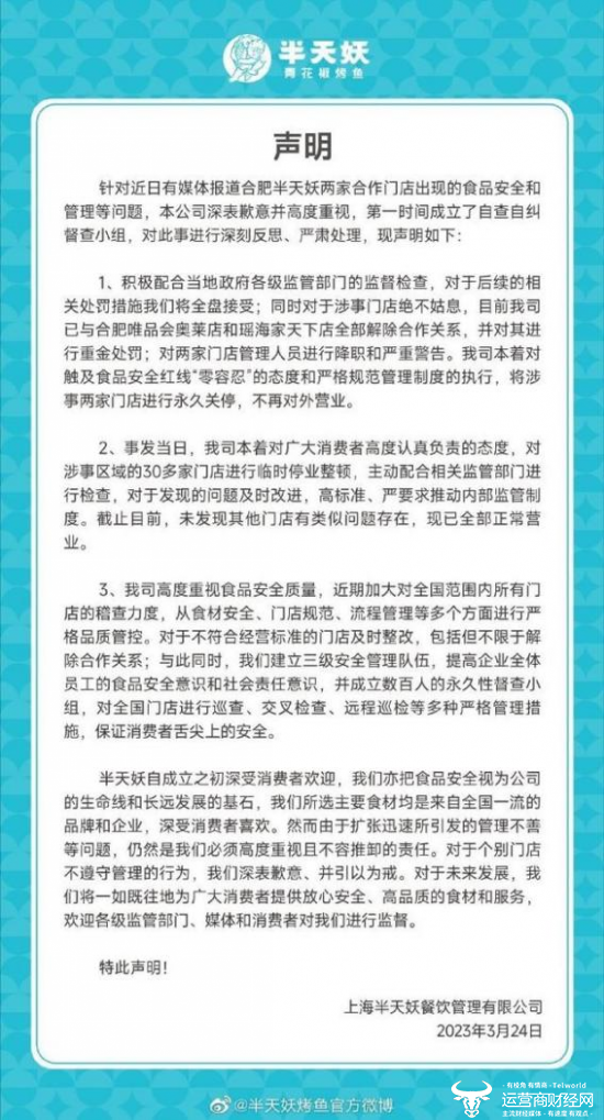 在此事被曝光之后,半天妖烤鱼官方发布声明致歉,表示公司已与涉事两家门店全部解除合作关系,并对其进行重金处罚,还对两家门店管理人员进行降职和严重警告。该声明还强调,本着对触及食品安全红线“零容忍”的态度和严格规范管理制度的执行,将涉事两家门店进行永久关停,不再对外营业。