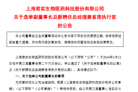 与此同时,君实生物聘任公司原副总邹建军为新的总经理兼首席执行官,负责主持公司全面工作。