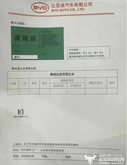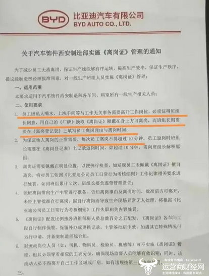 据网传图片显示,这份带有比亚迪汽车有限公司红头的文件提到:员工因私人喝水、上洗手间等与工作无关事务需要离开工作岗位,必须征得班组长同意,用自己的《厂牌》换取《离岗证》佩戴在身上方可离岗,而班组长则需要在《离岗登记表》上填写员工离岗理由与离岗时间。