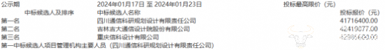 四天后,评标结果公示,三位中标候选人出炉。四川通信科研规划设计有限责任公司以4171.64万元的投标报价位列第一名;第二、第三位中标候选人分别为吉林吉大通信设计院股份有限公司、重庆信科设计有限公司,这两位候选人的报价均高于四川通信科研规划设计,分别约为4241.91万元、4298.56万元。