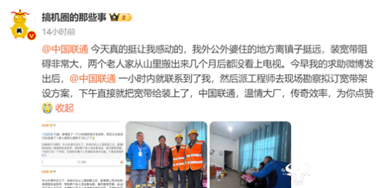 微博发布8小时,联通智家工程师开通了宽带和IPTV业务,并为老人家解决了电视机处无电源问题,贴心讲解了电视及网络使用方法,留下服务卡后才转身离开。客服人员第5次联系用户,询问使用情况,得到老人可以正常使用的反馈。