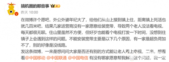 2月1日,网友“搞机圈的那些事”在网上发帖许愿给三家运营商,描述自己从山上搬到镇上居住的外公外婆,所住之处没有宽带,使两个老人没有电视看,每天感觉很无聊,希望有运营商能解决当地宽带资源的问题,为老人丰富晚年生活。