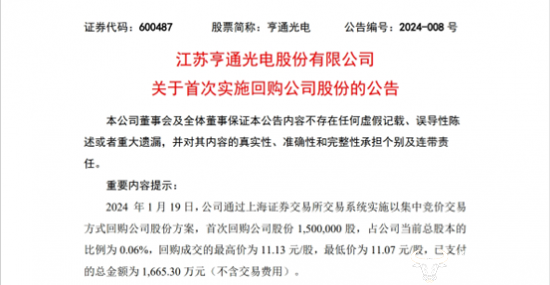 值得注意的是,2024年1月19日,亨通光电在上海证券交易所发布了一则关于《以集中竞价交易方式回购公司股份》的公告,将回购公司股份,目的是用于员工持股计划,回购资金总额为1-2亿元。