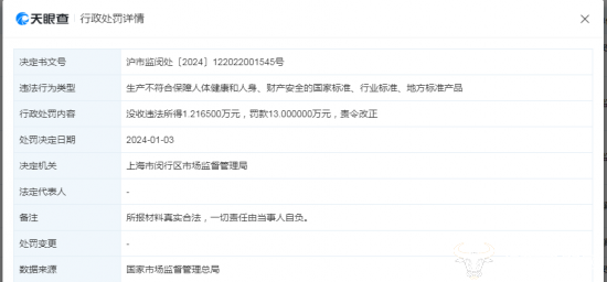 上述行为构成“生产不符合保障人体健康和人身、财产安全的国家标准、行业标准、地方标准产品”的行为,因此被上海市闵行区市场监督管理局于1月3日没收违法所得并处罚款13万元。