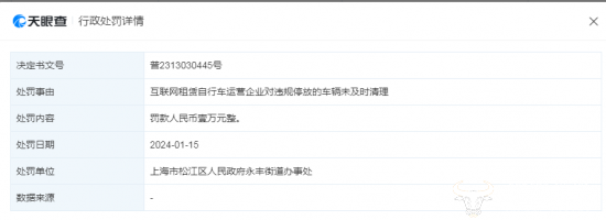 此外,在1月15日,其又因“互联网租赁自行车运营企业对违规停放的车辆未及时清理”又被上海市松江区人民政府永丰街道办事处罚款1万元。