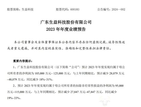 值得注意的是,1月29日晚,生益科技发布业绩预告,预计2023年年度实现归属于母公司所有者的净利润为10.5亿元~12.5亿元,与上年同期相比,预计减少约2.81亿元~4.81亿元,同比减少18%~31%。