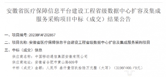 2024年1月22日,中标结果公布,安徽移动成功中标该项目。中标金额为3196万元,与项目最高限价仅差4万元。对于一个三千多万的项目来说,这个差价算是比较小的,但仍在合理范围之内。