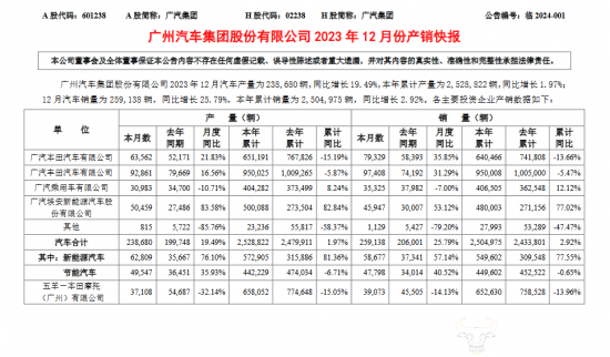 而运营商财经网注意到,广汽集团公布的2023年12月产销快报中,广汽埃安销量高于零售销量,与批发销量一致。