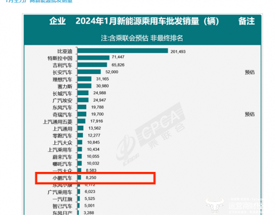乘联会披露,2024年1月,小鹏汽车新能源乘用车批发销量为8250辆,相比于2023年12月的20115辆,下降了11865辆。小鹏汽车官方公布的1月销量数据与乘联会公布的1月新能源乘用车批发销量一致。