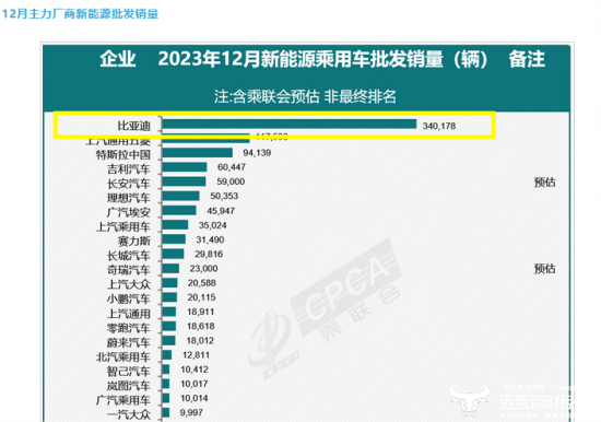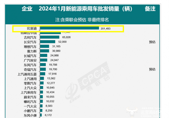 乘联会数据显示,2023年12月,比亚迪新能源乘用车批发销量为340178辆,排在榜单第一名位置。2024年1月,在该细分领域下,比亚迪销量骤减为201493辆。不过,仍然处于新能源乘用车批发销量第一名位置,且与第二名特斯拉中国差距很大。