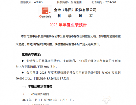 1月31日,金地集团发布2023年年度业绩预告,预计去年实现归属于母公司所有者的净利润为7.5亿元至9亿元,尽管如此,相比于之前还是下降了不少。