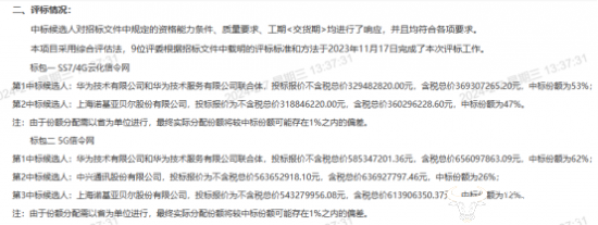 从中标结果来看,华为拿下的份额最大。标包一中,华为中标份额为53%,剩下的47%中标份额被上海诺基亚贝尔收入囊中;标包二中,华为的中标份额为62%,剩余份额被中兴通讯、诺基亚贝尔瓜分,其中,中兴通讯中标份额为26%,诺基亚贝尔的中标份额为12%。总的来看,华为中标份额的含税总价超过6亿元。