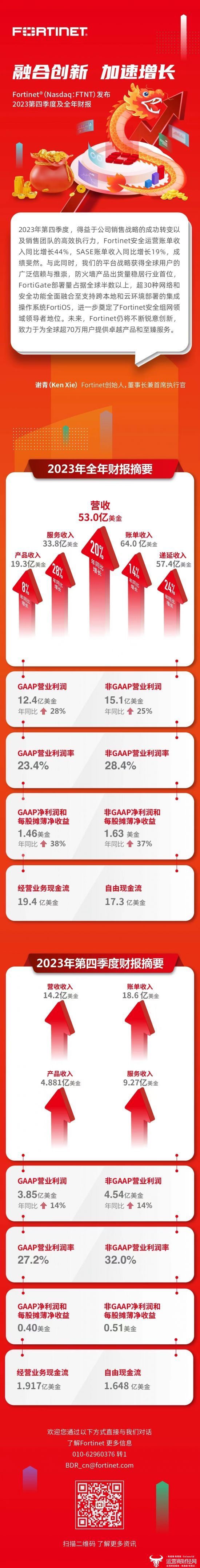 近日,专注于推动网络与安全融合的全球网络安全领导者 Fortinet®(Nasdaq:FTNT),发布其截至2023年12月31日的2023年第四季度及2023年全年财报。