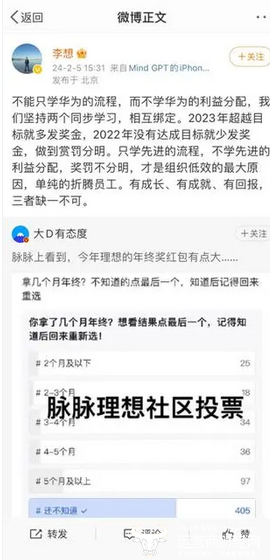 作为理想汽车创始人,李想也很快做出回复。他转发网友的截图表示:不能只学华为的流程,而不学华为的利益分配,我们坚持两个同步学习,相互绑定。2023年超越目标就多发奖金,2022年没有达成目标就少发降级呢,做到赏罚分明。但李想也没有正式上述截图提到的年终奖的真伪。