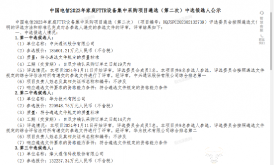 日前,中国电信公布2023年家庭FTTR设备集中采购项目遴选(第二次)中标候选人,中兴通讯、华为均在入围之列,但华为并非第一候选人,具体情况如何?投标企业的报价是否有很大差距?