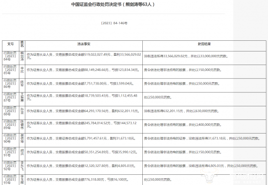 最终,熊剑涛被证监会没收违法所得33,566,029.02元,并罚款3300万元,且被终身禁入证券市场。此外,证监会还将招商证券1人涉嫌内幕交易行为移送司法机关处理;对46人采取行政监管措施,其中拟对3人采取认定为不适当人选,对5人采取监管谈话、38人采取出具警示函。
