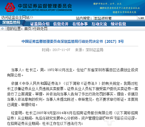 对此,深圳证监局没收杜长江违法所得38.46万元,并罚款38.46万元;对第二项违规行为,给予警告,并处以20万元罚款。