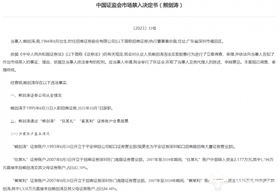 具体来看,招商证券原总裁熊剑涛自1995年开始,便陆续通过“熊剑涛”“任某礼”“崔某利”证券账户交易股票。经查,证监会认定熊剑涛交易股票总成交金额519,022,027.49元,盈利33,566,029.02元。