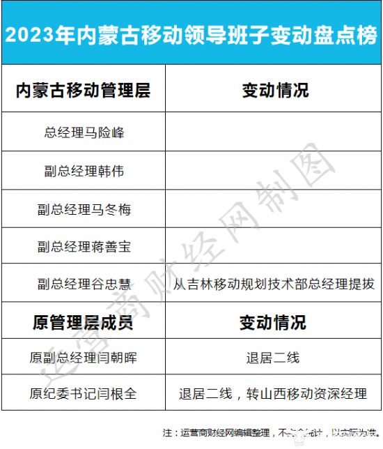 近日,运营商财经网梳理盘点了内蒙古移动2023年管理层变动情况,其中涉及三位副总经理的变动,有人提拔,也有人退居二线,接下来展开介绍。