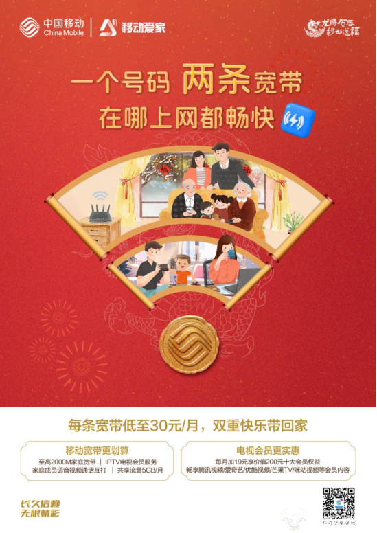 齐乐龙龙,移动爱家陪你一起闹元宵。中国移动移动爱家品牌以科技赋能智慧家,让AI融通家庭全场景,除了“双宽带”的特惠活动外,移动爱家品牌还包含智家小福袋、移动高清、移动到家等超值产品,用科技+服务助力客户体验数智“美好家”,快来中国移动app或营业厅了解一下吧!