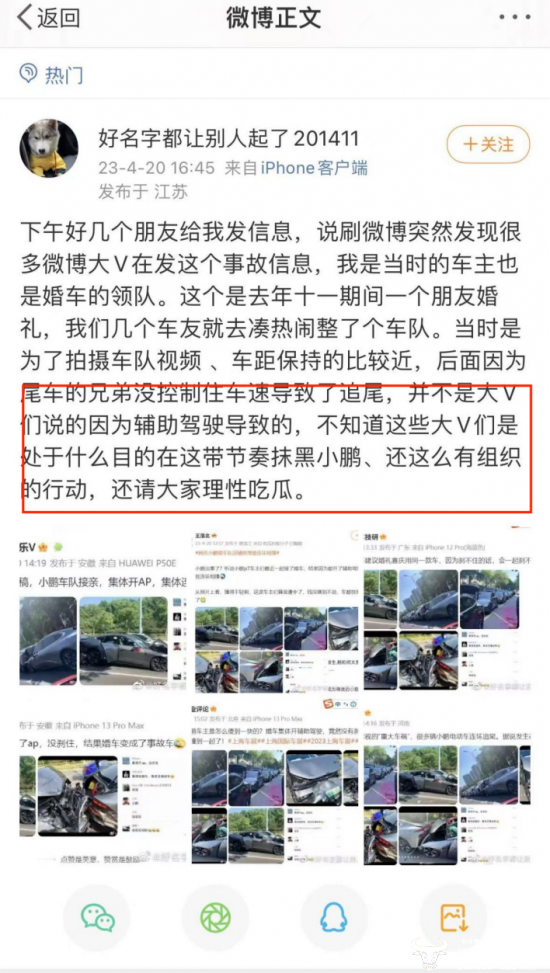 在2023年4月,曾有多个自媒体账号披露消息称:小鹏婚车队因辅助驾驶连环相撞。后来有网友自称是婚车的领队,他表示:追尾是因为尾车的兄弟没控制住车速,并不是辅助驾驶导致的。此外网友还力挺小鹏汽车表示这些账号都是带节奏抹黑小鹏,是有组织的行动。
