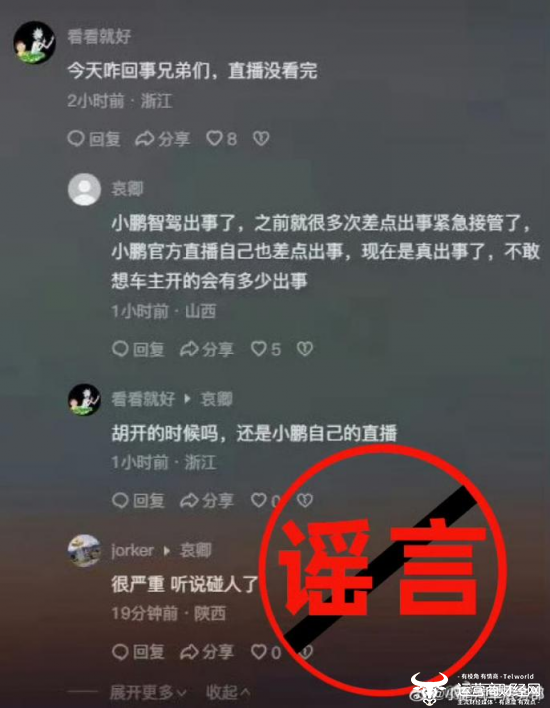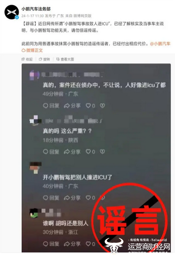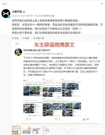次日,小鹏汽车转发该博文辟谣,该博文可谓给小鹏汽车及时提供了反驳的依据。