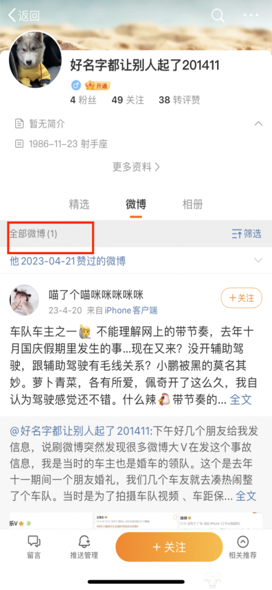 不过运营商财经网注意到,自称是婚车领队的网友微博注册时间是2023年4月20日,发文辟谣时间也是2023年4月20日。也就是说,他可能为了帮助小鹏汽车辟谣专门注册了一个微博账号。此外,没有看到任何可以确定他婚车领队身份的资料。目前,该网友微博只有这一条为小鹏智驾事故辟谣的微博。