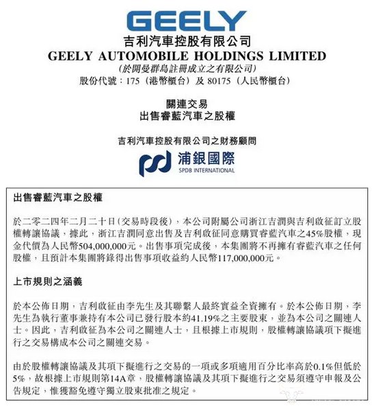 2月20日,吉利汽车控股有限公司发布公告表示:附属公司浙江吉润与吉利启征订立股权转让协议,据此,浙江吉润同意出售及吉利启征同意购买睿蓝汽车之45%股权。据公告内容透露,出售事项完成后,该集团将不再拥有睿蓝汽车之任何股权。