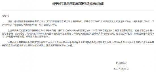 值得一提的是,2023年9月13日,西南证券股份有限公司董事韦思羽被重庆证监局出具警示函。其母亲于2023年5月9日买入公司股票1000股,成交金额4070元,于2023年5月10日卖出公司股票1000股,成交金额4000元,上述期间内买卖西南证券股票的行为构成短线交易的违规行为,相关情况被记入韦思羽个人证券期货市场诚信档案。