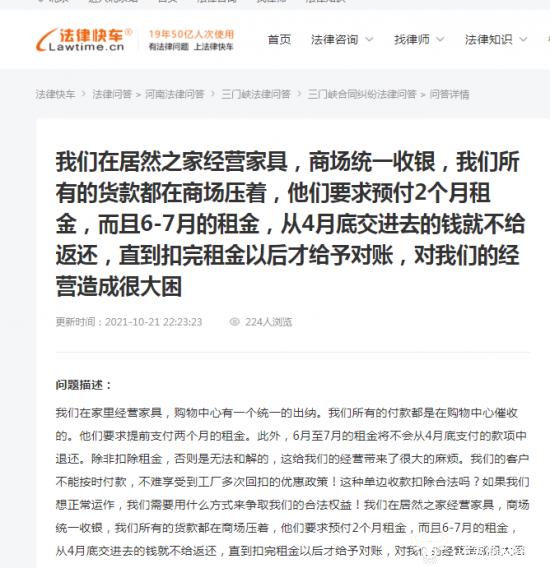 此外,通过搜索居然之家相关关键词发现,在某平台的法律问答中,就有商户曾提问道,自己所有的货款都在商场压着,卖场则要求预付两个月租金,否则4月底交进去的钱就不给返还,除非扣完押金才让对账,这给他们的经营造成了很大的麻烦。不过该事的真实度存疑。