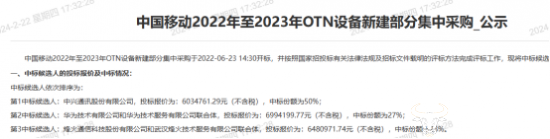 同年,中国移动曾公示了2022年至2023年OTN设备新建部分集中采购结果,中兴通讯拿下一半的中标份额,投标报价最高的华为联合体中标份额为27%,剩下23%由烽火通信联合体拿下。