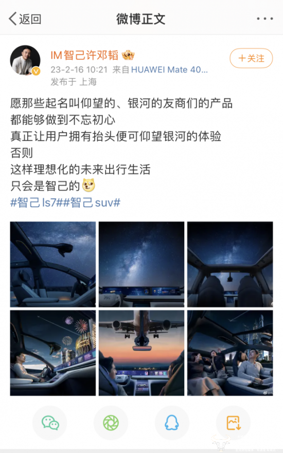 不过,许邓韬很看好自家品牌。日前,他在个人社媒平台上发文称:愿那些起名叫仰望的、银河的友商们的产品都能够做到不忘初心,真正让用户拥有抬头便可仰望银河的体验,否则这样理想化的未来出行生活,只会是智己的。