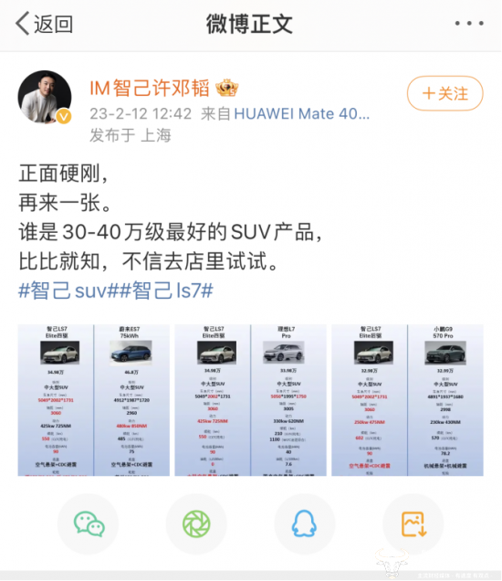 此外,他还曾直接披露智己LS7和蔚来ES7、理想L7、小鹏G9在各方面的对比图,并称:正面硬刚,再来一张。还喊话称:谁是30-40万级最 好的SUV产品,比比就知,不信去店里试试。