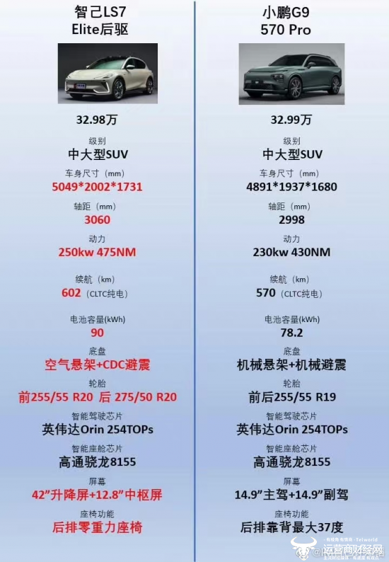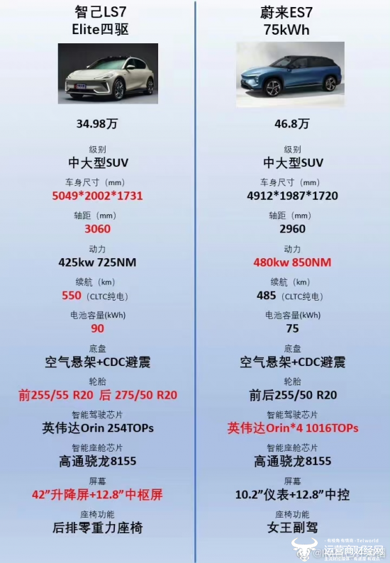 从许邓韬披露的图片来看,智己汽车似乎确实在多个方面强于其他三个品牌。然而运营商财经网发现,针对不同的品牌,智己汽车拿出对比的车型也不同,比如蔚来ES7 75 kWh车型是蔚来起售价车型,而与其对比的智己LS7 Elite四驱是智己LS7中等售价区间的车型;小鹏G9 570Pro是小鹏G9起售价车型,与之对比的智己LS7 Elite后驱版也是智己LS7中等售价区间车型。