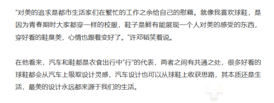 值得一提的是,许邓韬透露自己是一个球鞋爱好者,收藏了很多球鞋。他曾在采访中表示,许多汽车设计思路都可以从球鞋中获得。