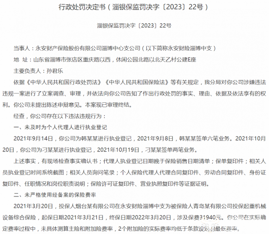 引入注意的是,2023年3月22日,永安财产保险股份有限公司淄博中心支公司因存在未及时为个人代理人进行执业登记、未严格使用经备案的保险费率,被中国银保监会淄博监管分局责令改正并合计罚款13万元,2名责任人分别被警告并罚款1万元、1.5万元。