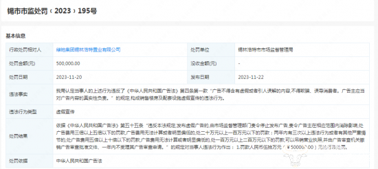 2023年11月,内蒙古锡林浩特市市场监督管理局对绿地集团锡林浩特置业公司罚款50万元。市监局认定,该公司违反了《广告法》第四条第一款“广告不得含有虚假或者引人误解的内容,不得欺骗、误导消费者。广告主应当对广告内容的真实性负责。”的规定,构成销售楼房及配套设施虚假宣传的违法行为。