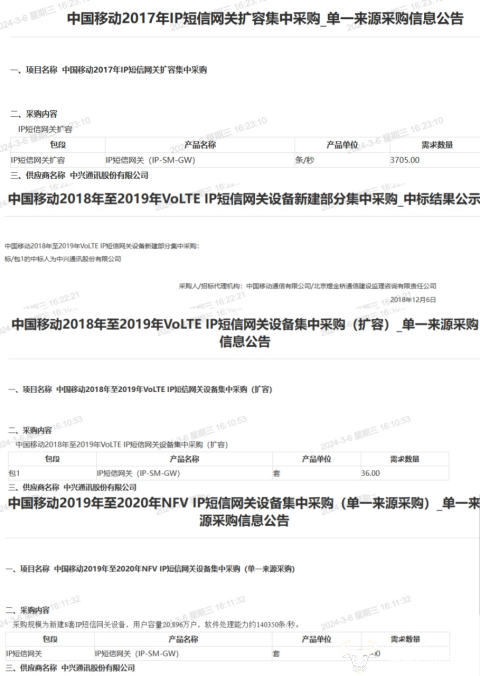 运营商财经网查询发现,关于中国移动的IP短信网关工程,大部分都是由中兴通讯作为供应商的。最早在2017年,中兴通讯就作为单一来源供应商负责中国移动的IP短信网关扩容,2018-2020年的IP短信网关采购项目也几乎被中兴通讯包揽。