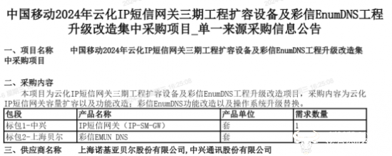 值得一提的是,今年2月1日,中国移动曾公布2024年云化IP短信网关三期工程扩容设备及彩信EnumDNS工程升级改造集中采购项目的单一来源采购信息公告,该项目的IP短信网关标包被中兴通讯拿下,彩信工程的标包被诺基亚贝尔获得。