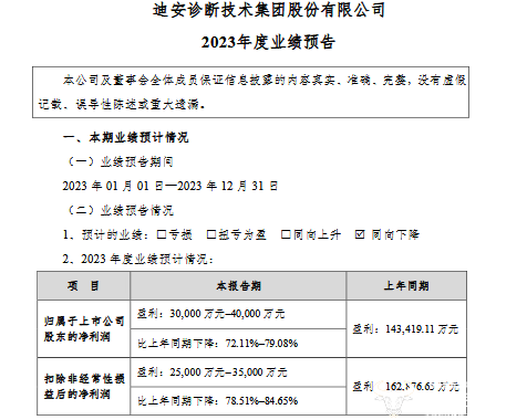 1月31日晚,迪安诊断发布去年年度业绩预告,预计归属于上市公司股东的净利润比上年同期下降72.11%—79.08%,至盈利3亿元—4亿元;预计扣除非经常性损益后的净利润同比下降78.51%—84.65%,至盈利2.5亿元—3.5亿元。