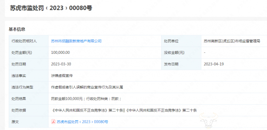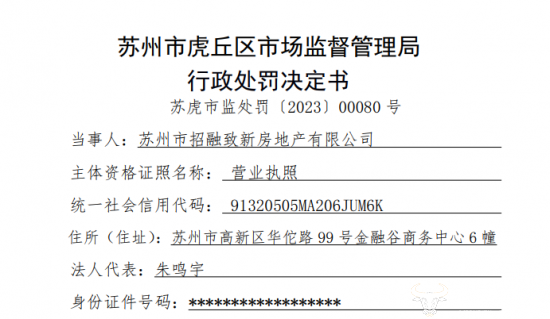 去年,招商蛇口的子公司“苏州市招融致新房地产有限公司”因涉及虚假宣传,被苏州高新区市场监督管理局处罚10万元,因此被列入榜单。