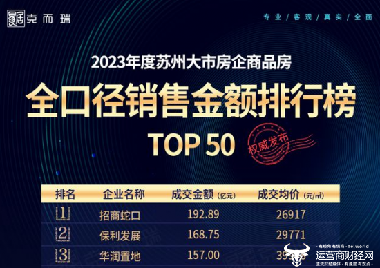 据克而瑞发布的《2023年度苏州大市全口径销售金额排行榜》显示,招商蛇口以192.89亿元的全口径销售业绩位居第一。