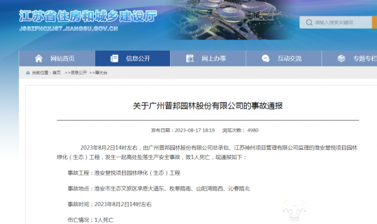 根据江苏省住建厅发布的通报来看,2023年8月,保利淮安房地产发展公司所建设的淮安堂悦项目园林绿化工程,发生了一起高处坠落生产安全事故,导致1人死亡。