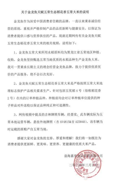 对此,金龙鱼回应表示,“金龙鱼坚持甄选五常当地优质的水稻品种生产金龙鱼大米。我司一贯秉承长期主义的理念经营金龙鱼品牌,致力于提供优质优价的产品服务,绝不会以次充好”。视频当中的车辆当时运载的原粮产自五常当地。